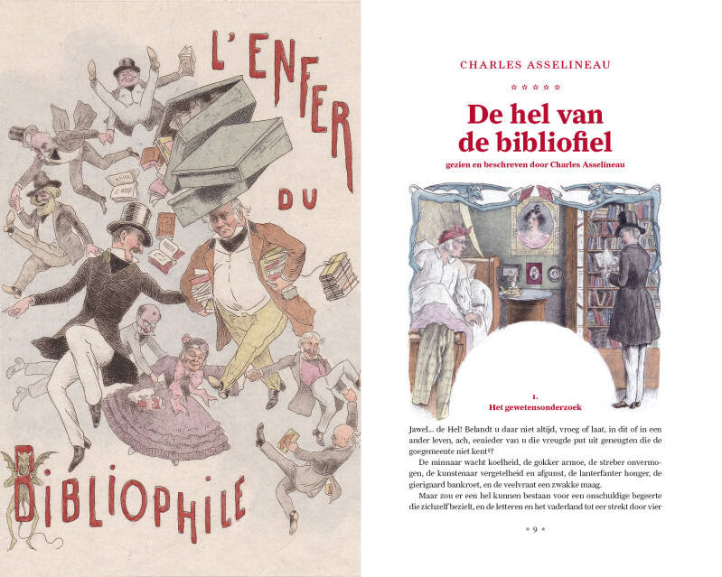 In 1860 verscheen een verhaal van Charles Asselineau in boekdruk met de titel L’Enfer du bibliophile. Asselineau vertelt daarin over een nachtmerrie waarin een boekenvriend tegen wil en dank door een demon gedwongen wordt waardeloze boeken aan te schaffen voor een te hoge prijs. Vervolgens belandt hij in de hellecirkels van de boekbinder en het veilinghuis. Ten slotte is hij getuige van de plundering van zijn bibliotheek.