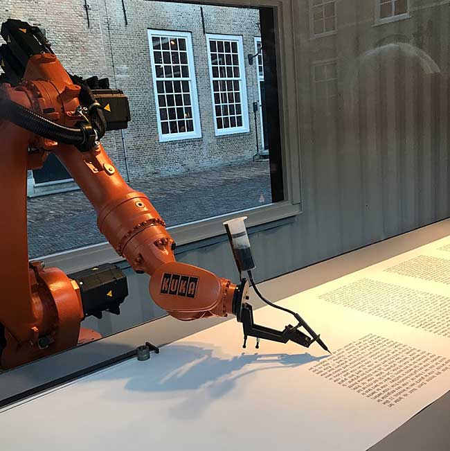 De pen die in een gestage cadans letters op het papier tekent wordt aangestuurd door een robotarm. Onvermoeibaar worden 24 uur per dag lettertekens toegevoegd aan een tekst die uiteindelijk een geschreven versie oplevert van de Statenbijbel, de eerste officiële Nederlandstalige Bijbelvertaling, waarvoor opdracht werd gegeven in 1618 tijdens de Synode van Dordrecht.